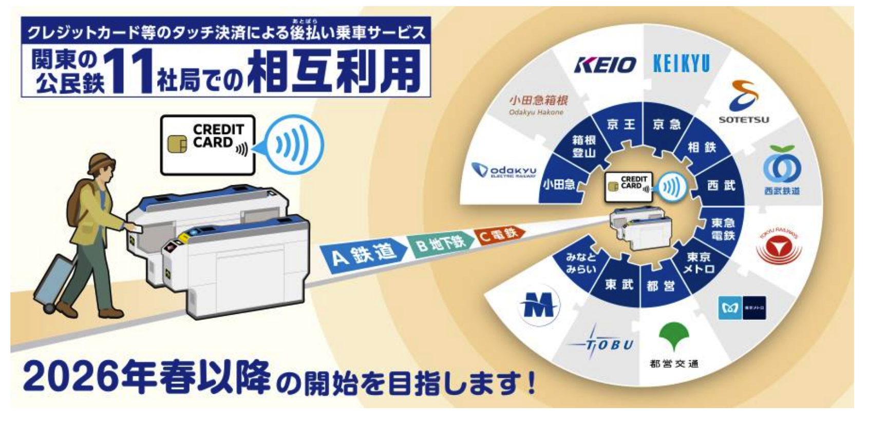 2026 年春以降は、対象となる鉄道事業者内での利用に加えて、相互に乗り継ぐご利用(相互利用)が可能になる。対応する決済ブランドは、Visa・Mastercard・JCB・American Express・Diners Club・Discover・銀聯の7ブランドを予定する。