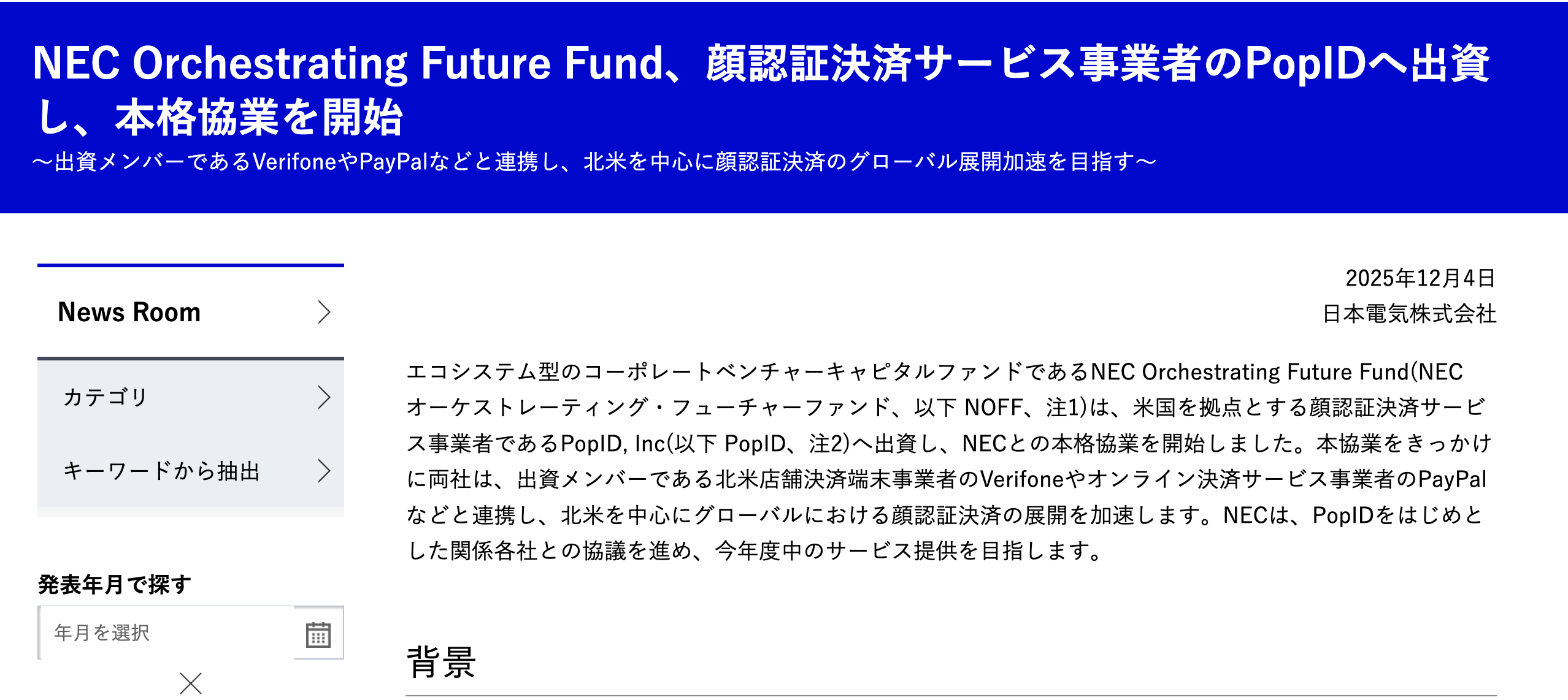 エコシステム型のコーポレートベンチャーキャピタルファンドであるNEC Orchestrating Future Fund(以下、「NOFF」)は、米国を拠点とする顔認証決済サービス事業者であるPopID, Inc(以下、「PopID」)へ出資し、NECとの本格協業を開始したと発表した。同協業をきっかけに両社は、出資メンバーである北米店舗決済端末事業者のVerifoneやオンライン決済サービス事業者のPayPalなどと連携し、北米を中心にグローバルにおける顔認証決済の展開を加速する。NECは、PopIDをはじめとした関係各社との協議を進め、今年度中のサービス提供を目指す。
