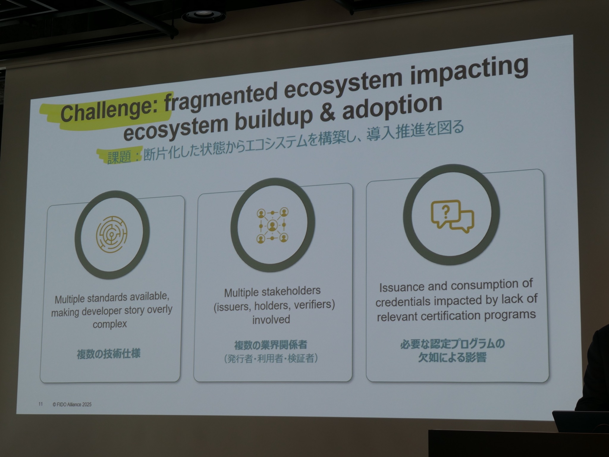 「実はさまざまな組織によって何十年もこういう話はされてきたが、エコシステムが細分化されており課題がある。われわれFIDO以外にもISOやOIDF、W3Cから複数の技術仕様が出ているが、管理者も発行者もクレデンシャルの検証者も複雑化しており、それらをエンド・トゥ・エンドでとらえた検証テストがない。その結果、(デジタルクレデンシャルの)採用が進まずに遅延し、みな投資をためらっている状況だ」(シキア氏)