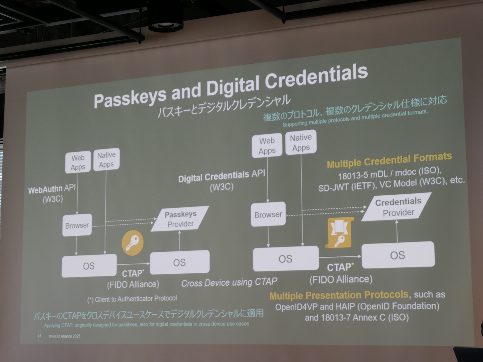 またパスキーと「デジタルクレデンシャル/デジタルIDウォレット」との技術連携については「(FIDO2仕様の一部である)『CTAP』から活用していけるようにする」とのこと(画面3)。実現すれば、デジタルIDウォレットを「(複数端末からのアクセスを可能にする)クロスデバイスのユースケースでも使えるようになる」(シキア氏)という。