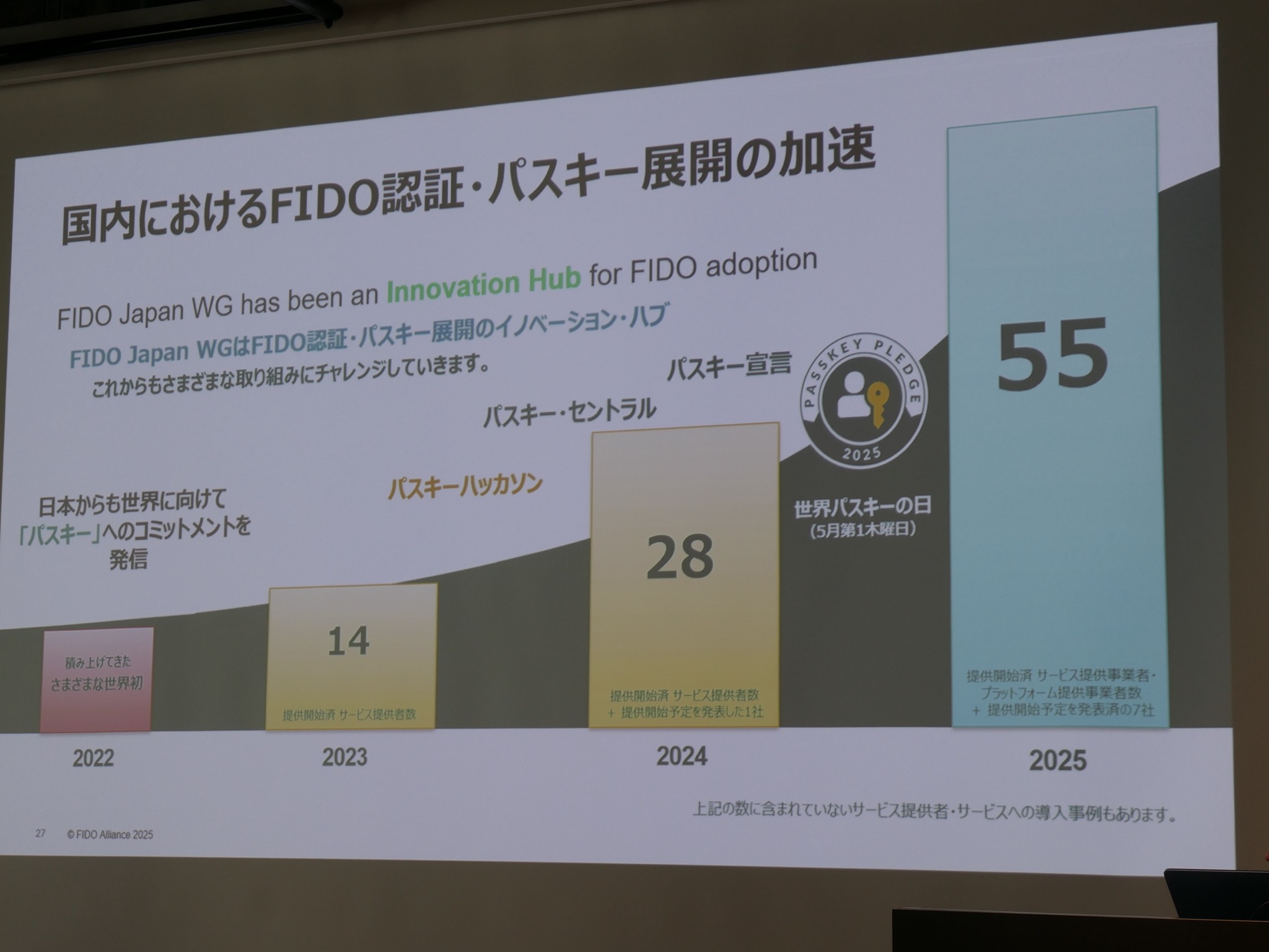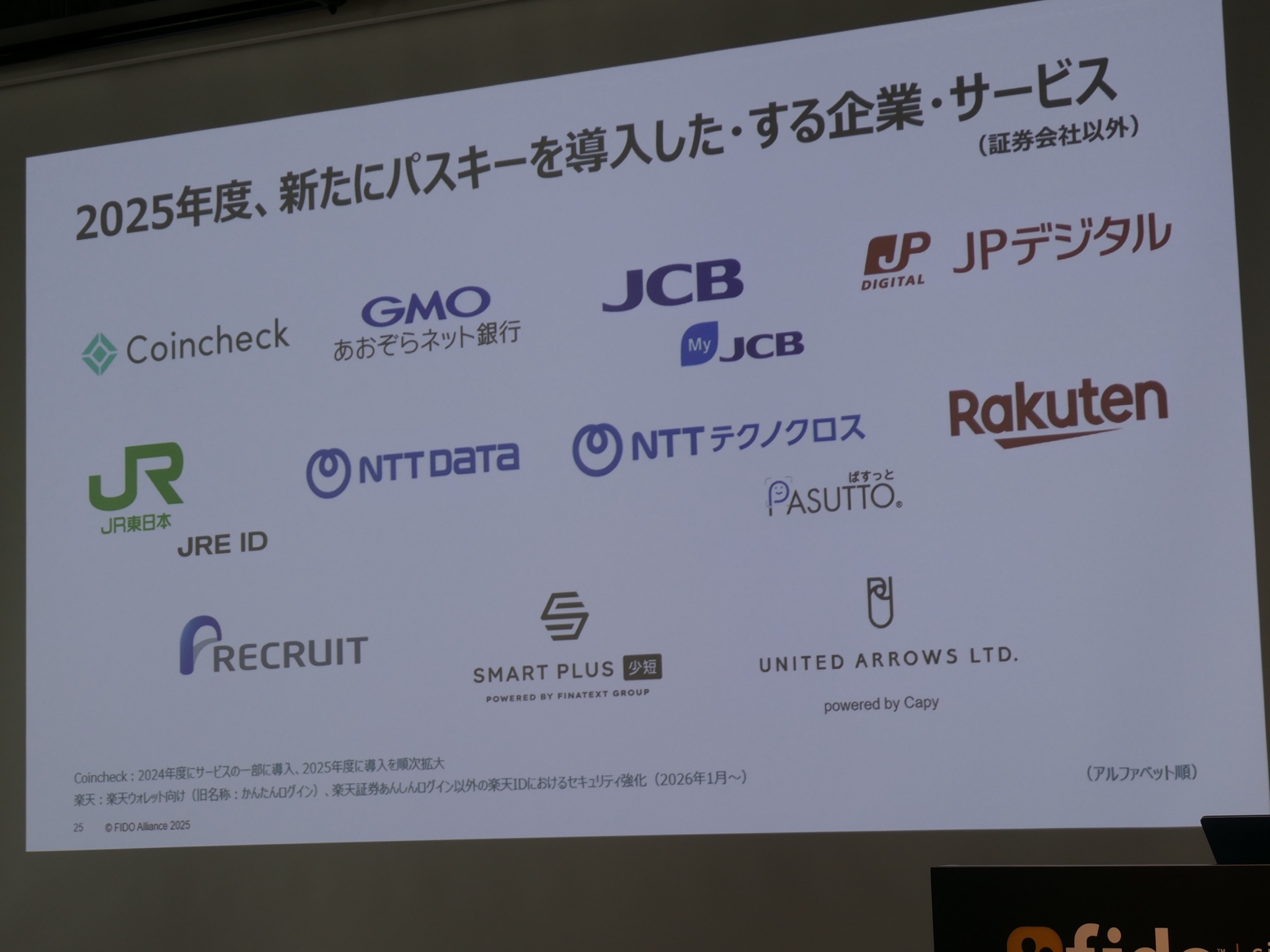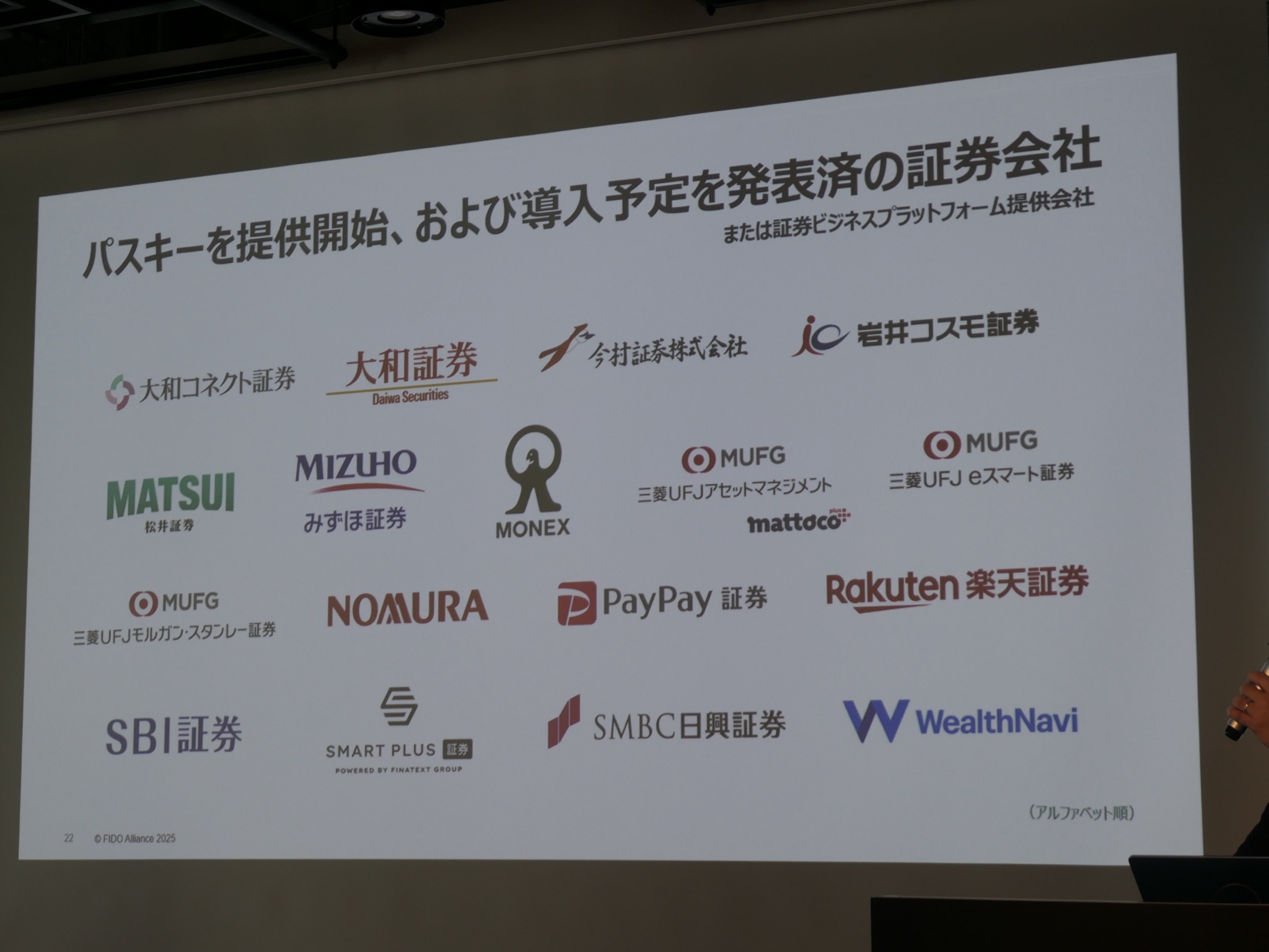 記者説明会ではこの1年間の日本国内におけるパスキー躍進の動向も紹介された。特に2025年は、証券業界が見舞われた不正ログイン被害拡大への対抗策としても大いに注目されたパスキーだったが、10月に金融庁と日本証券業協会が監督指針とガイドラインを改正し、ログインや出金、出金先銀行口座の変更など、重要な操作を行う際には「フィッシングに耐性のある多要素認証の実装と必須化」の文言が盛り込まれた。その具体例として示されたのがパスキーだ。
