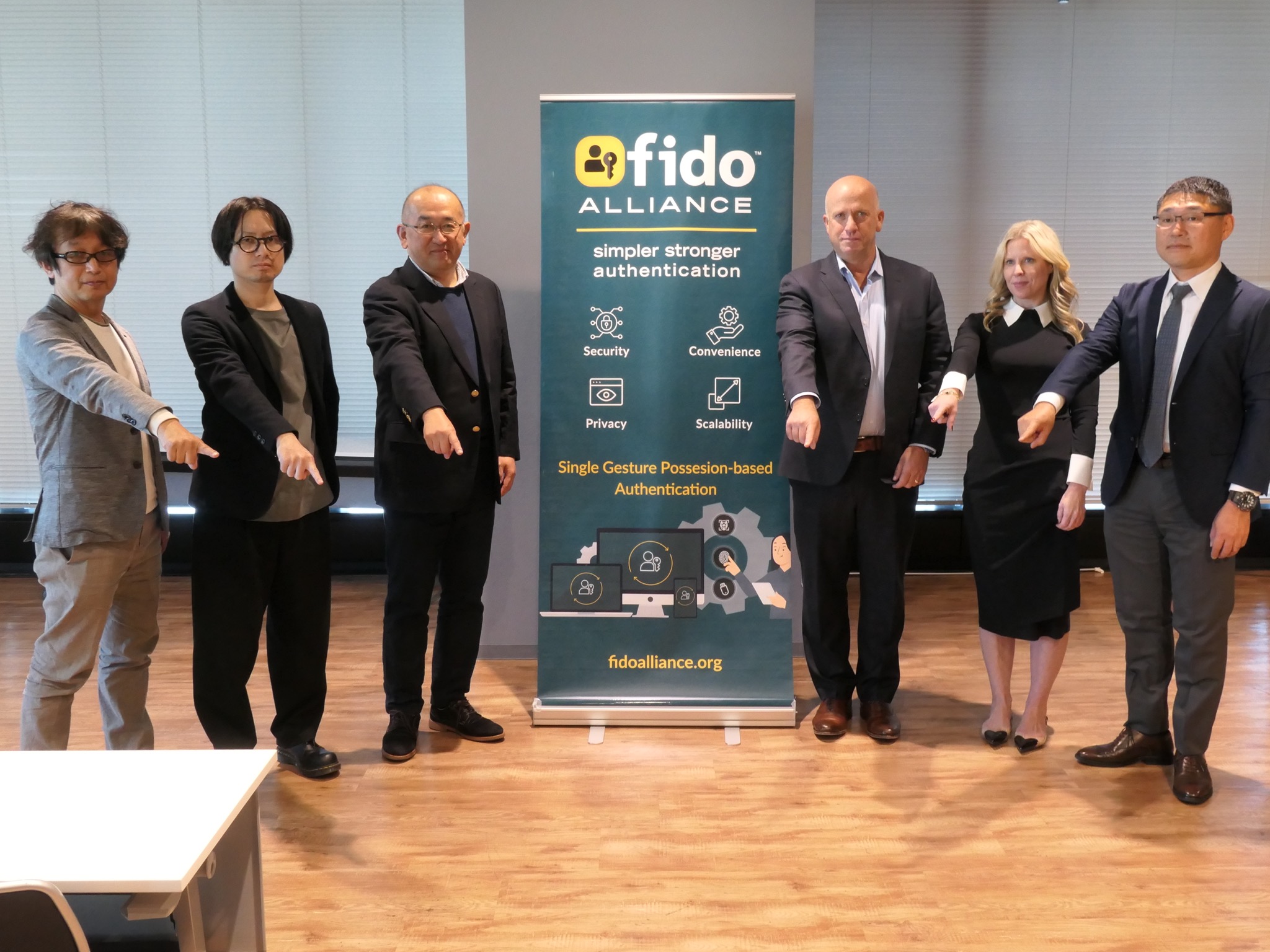 写真3 FIDOアライアンスの日本支部であるFIDO Japan WGの活動は、今月で毎月の定例会合が111回目を迎えたとのこと。恒例のFIDOポーズによる記念撮影。左から、FIDOアライアンス・ボードメンバー FIDO Japan WG 副座長/メルカリ執行役員 CISOの市原 尚久氏、FIDOアライアンス・ボードメンバー FIDO Japan WG 副座長/LINEヤフー ID会員サービスSBU ID ユニットユニットリードの伊藤 雄哉氏、FIDOアライアンス・執行評議会・ボードメンバー兼 FIDO Japan WG 座長/NTT ドコモ チーフセキュリティアーキテクトの森山 光一氏、FIDOアライアンス・エグゼクティブディレクター 兼 CEOのアンドリュー・シキア氏、FIDOアライアンス・チーフ・マーケティング・オフィサーのメーガン・シャーマス氏、FIDOアライアンス・APACマーケット開発シニアマネージャーの土屋 敦裕氏