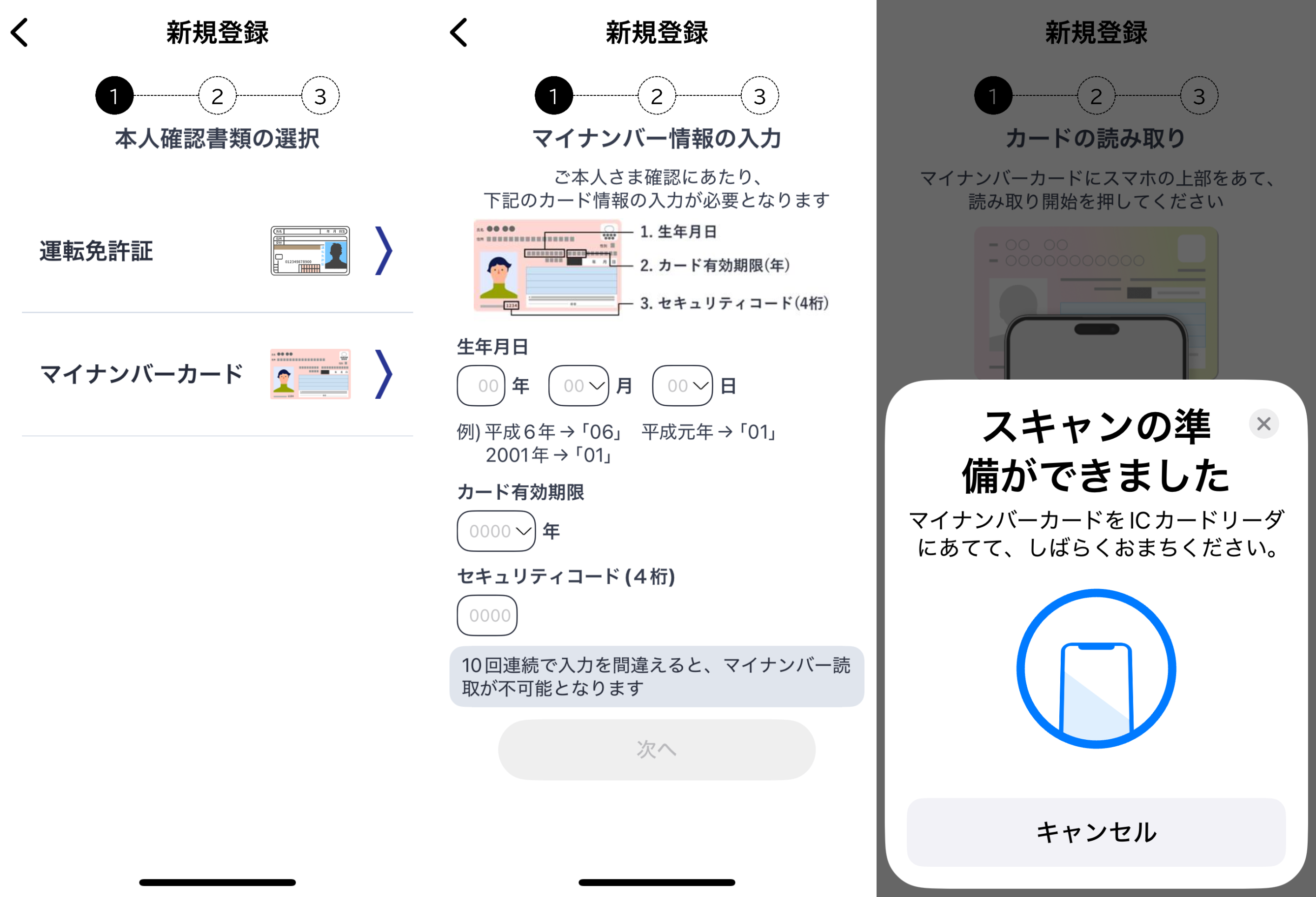 画面3〜5 本人確認書類を選んだら、ICチップの読み取りなどの手順へ進む