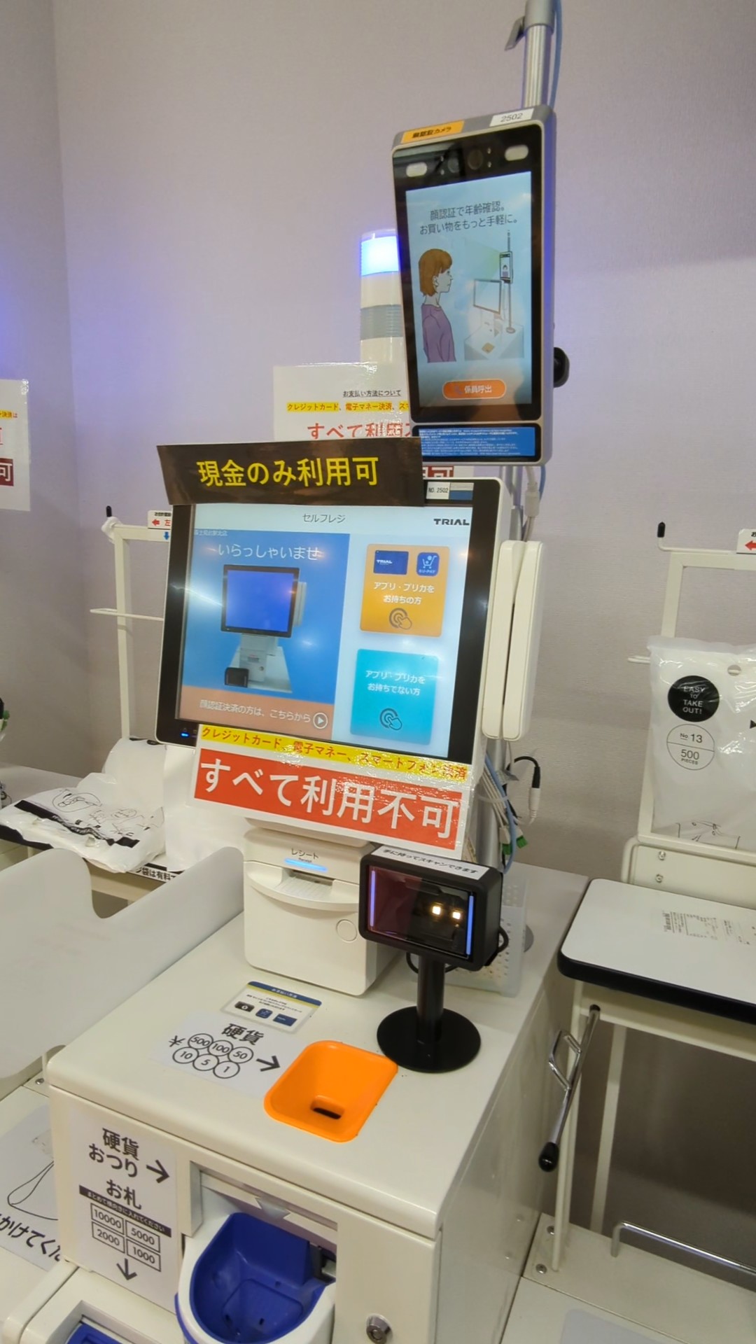 しかし、TRIAL GOは違う。お客がレジ前に来てまず一番最初に顔認証の操作手順が来る。顔認証に要する処理時間は瞬時とは言えないが、レジの傍に買い物カゴを置いたりした直後のこともあってか、さほど待たされている感じはしなかった。