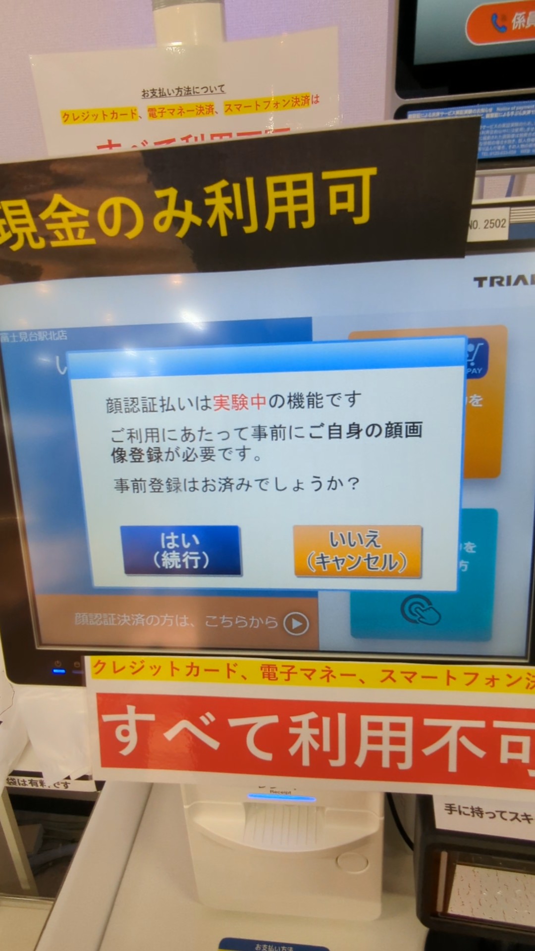 するといきなりPOSレジのTOP画面に、SU-PAYのアプリかプリカを持っている・持っていないの意思表示ボタンと並んで、「顔認証決済の方は、こちらから」の赤いボタンが(写真4)。迷わずに顔認証決済を選ぶ。すると、同機能が実験中であることと、顔画像の事前登録が済んでいるかの確認画面が表示された(写真5)。ここで「はい(続行)」を押すと、レジ用の防犯カメラと思っていたディスプレイ付きカメラの画面が切り替わり、顔認証がスタートした。