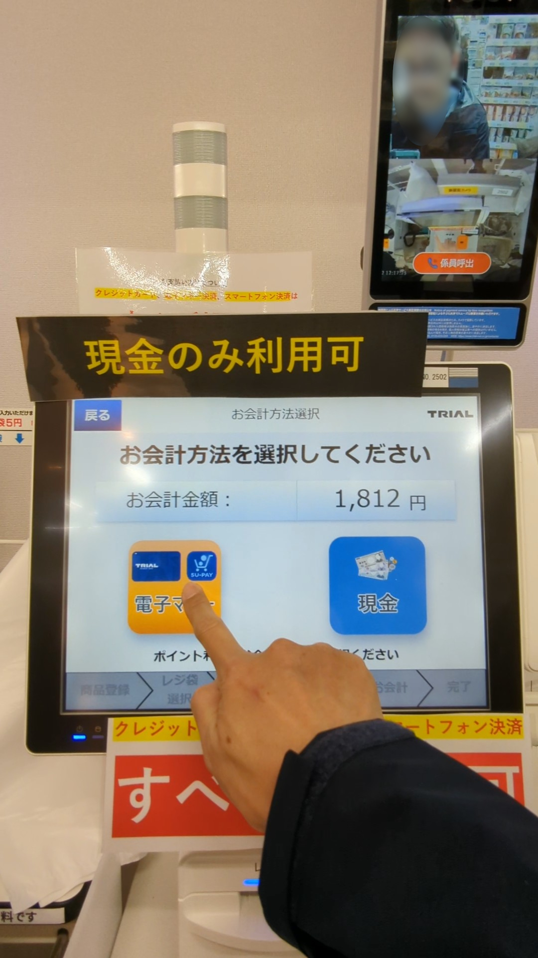 商品スキャンがすべて終わったら有料のレジ袋の必要有無を選択し、いよいよ会計へ。会計画面では「電子マネー(トライアルプリペイドカード/SU-PAYアプリ)」と「現金」の2択のボタンが表示された(写真7)。ちなみにシステムの都合上、現段階ではクレジットカードや電子マネー、スマートフォン決済のキャッシュレスは利用できず、現金かSU-PAYのみ利用可能になっていた。