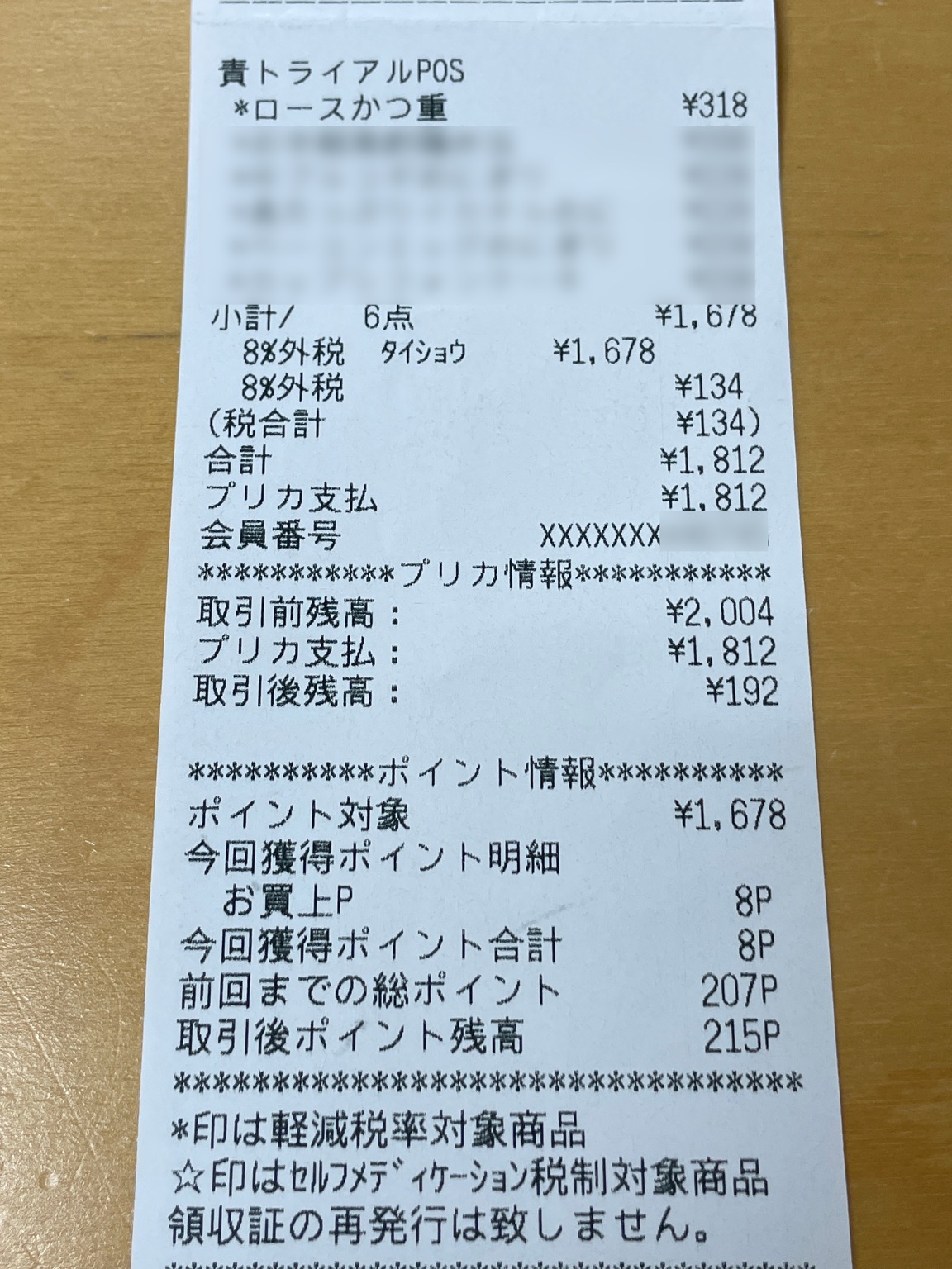写真9 レシートの決済欄には「プリカ支払」と記載され、会員番号や残高情報などのみが併記されており、「顔認証決済」であることを区別する表記は見られない(写真は一部、修整しています)