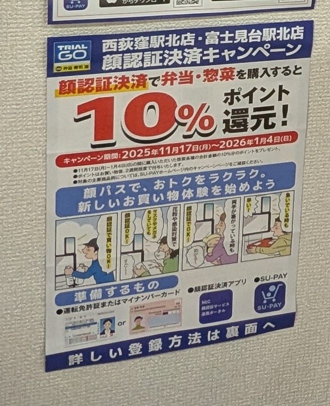 ちょっと評価が高過ぎではないか? いやいや、論より証拠。東京で暮らす皆さんもぜひTRIAL GOを訪れてSU-PAYの顔認証決済を試してみてほしい。来年1月4日まではポイントが10%還元になるキャンペーンを実施中の店舗もあるので(写真10)、よくチェック&顔認証決済の事前準備をした上でお店へGOだ。