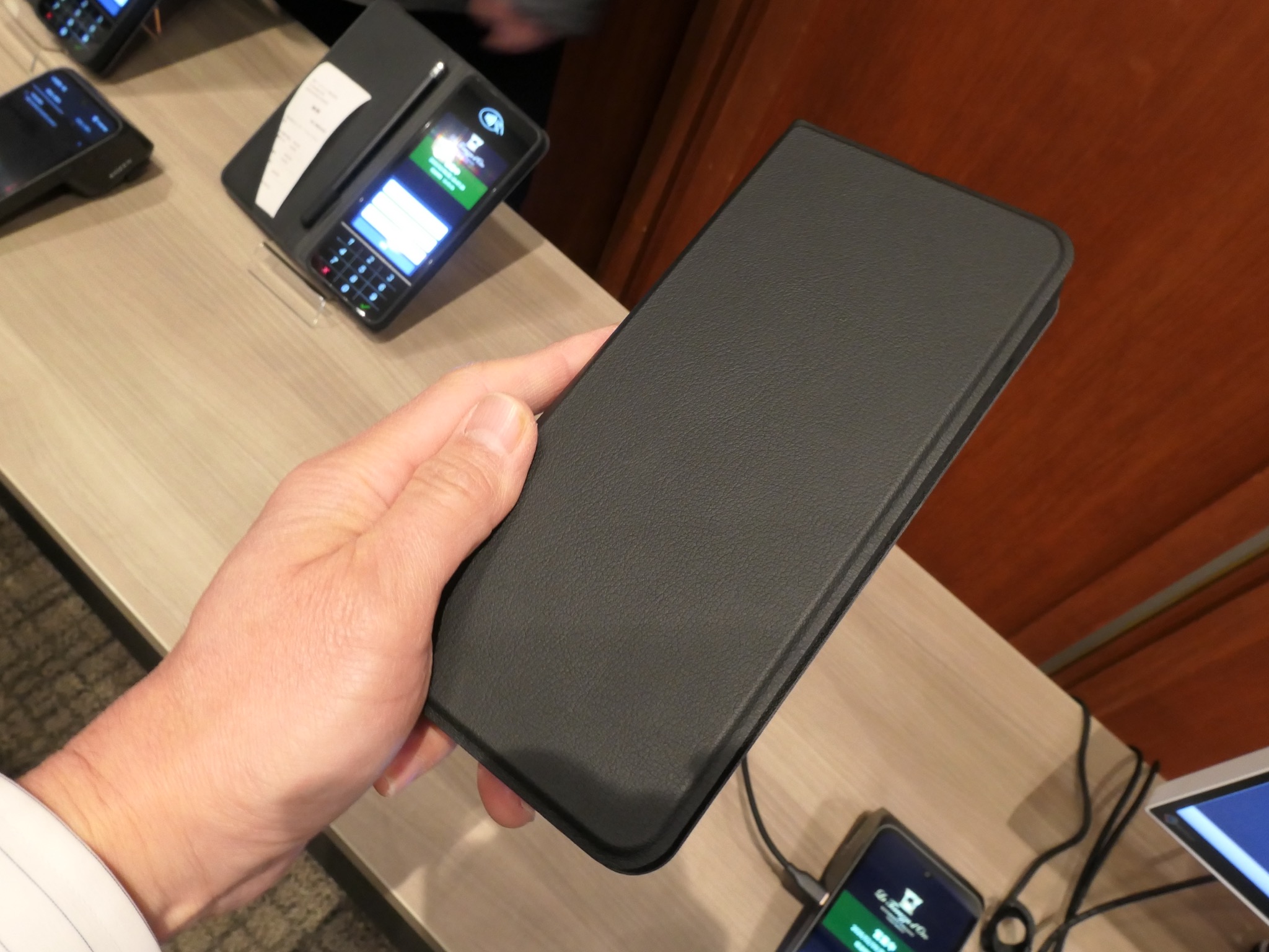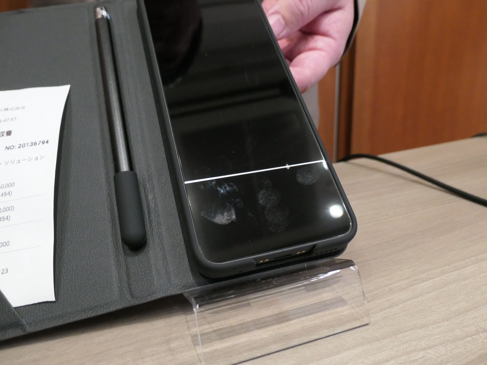 S-pitt Airの最大の特徴はその外観にある。レシートや領収書などと一緒にビルホルダーに挟んでも違和感のない「厚さ9.99ミリ」という極薄設計(写真6)からは、少し大きめのスマートフォンと見間違えそうな印象を受ける(重量は220グラム)。全面がフルフラットなのですべて液晶画面と勘違いしてしまいそうだが(写真7)、実は下部4分の1ほどが液晶画面とは分離されていて、暗証番号を入力するための専用PINパッドになっている。この部分はソフトウェアで「表示」されるのではなく、実際にハードウェアのPINパッド(ハードPIN)が内蔵されている(写真8)。
