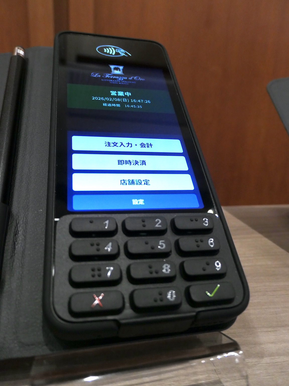 皆様もご経験されていると存じますが、多くの高級レストランなどの飲食店では、この『PINバイパス』を利用してお食事をされたテーブルに伝票を運び、サインを頂く形のテーブル決済が採用されておりました。私たちはこのスタイルで行われるテーブル決済のことを『サイン・オン・ペーパー(Sign on Paper)』と呼んでおります。この『サイン・オン・ペーパー』という決済の所作は、レストランなどで、接客現場の試行錯誤の中で生まれたものです。支払う方はご一緒している方との会話中にさりげなく手渡されるビルホルダー(筆者注:主にレザー製で二つ折り形状の、伝票やお札などをはさめるケース)を受け取り。お話を続けながらさりげなく中身を確認して、クレジットカードを挟んで店員に手渡す。店員はそれをカウンターに持ち帰り、伝票を作り、再度テーブルへ。お客様は会話を続けながら伝票にサインして支払いが終わる。非常にエレガントで洗練された所作であったと、私たちは考えております。日頃見慣れたスムーズな決済所作でした。