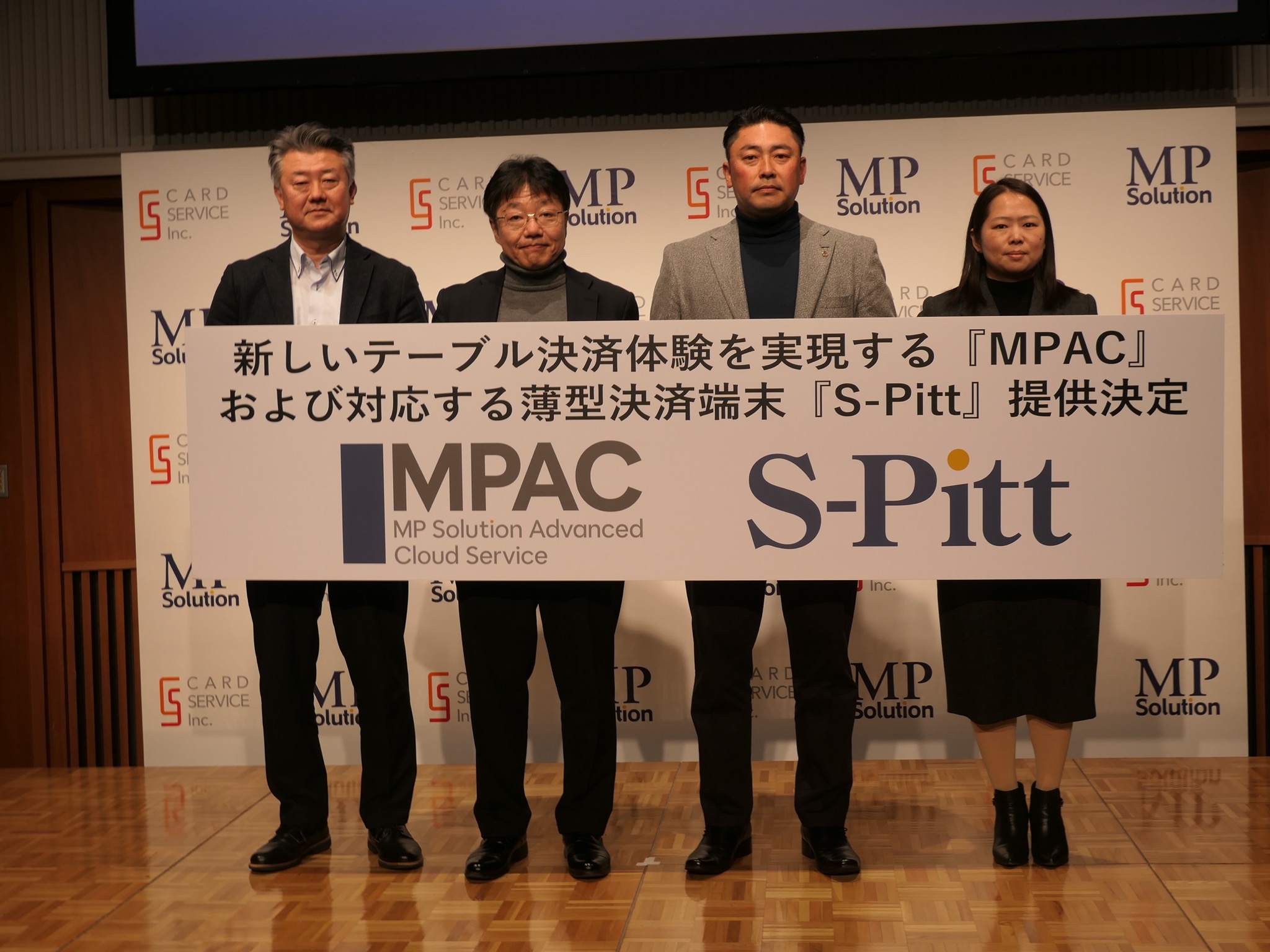 写真15 記者発表会の登壇者。左から、三菱UFJ銀行 法人デジタル戦略部 ペイメント戦略室 室長の尾中 壱行氏、エム・ピー・ソリューション 専務取締役の林 和宏氏、カードサービス 代表取締役社長の齋藤 賢志氏、XC TECH Key Account Director Mandy Luo氏
